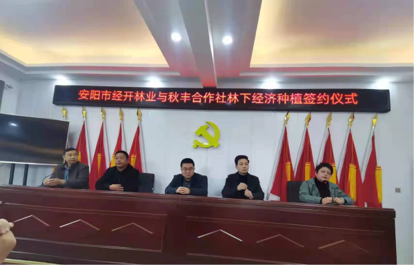 2022年3月9日,經(jīng)開林業(yè)公司與曲溝鎮(zhèn)秋豐合作社在曲溝鎮(zhèn)東彰武村舉行安陽市國儲林項目林下經(jīng)濟(jì)合作開發(fā)簽約儀式,本次簽約儀式由曲溝鎮(zhèn)副鎮(zhèn)長王安玉主持,殷都區(qū)林業(yè)局、經(jīng)開林業(yè)公司及秋豐合作社相關(guān)人員出席簽約儀式。